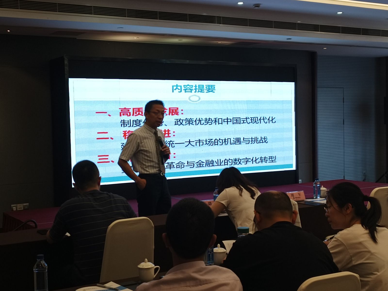 此次培训邀请刘教授授课。刘教授围绕高质量发展:制度优势、政策优势和中国式现代化、稳中求进:建设全国统一大市场的机遇与挑战、深度融合:数字经济革命与金融业的数字化转型等几个方面,从国家和江苏层面,介绍了“十四五”时期金融业面临新形势新任务和推动金融高质量发展的总体思路,授课视野宏大、层次鲜明、分析精准、新见迭出。